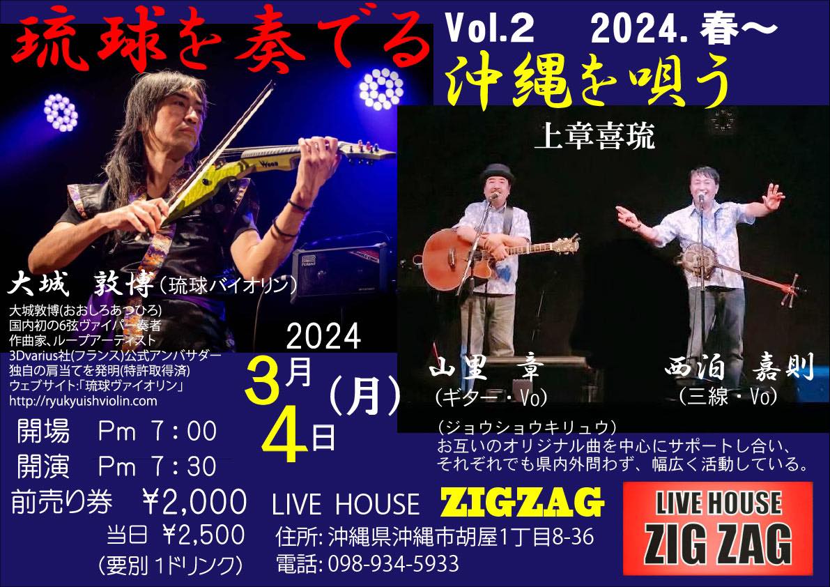 ZIG ZAG 胡屋1-8-36 2F 沖縄市 沖縄県 日本琉球を奏でる 沖縄を唄うVol.2 日時:2024.3.4.(月) 開場:19:00 開演:19:30 出演: ○上章喜琉 山里章:ギター 西泊喜則:唄三線 ○琉球提琴曲 大城敦博:ヴァイオリン & ヴァイパー […]