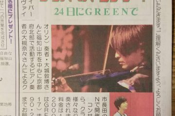 京都新聞(丹波版)に掲載していただきました。 記事中の、沖縄での琉球ヴァイオリンコンサート後にいただいた手紙(抜粋) 「会を重ねるごとに感動が深くなってきました。様々な国の音楽とか民謡という音楽をよく聴きますが、私たちの[…]