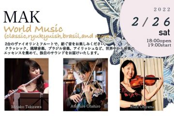 開始時刻が変更されました。 凄く美味しいよっさんプレート(1500円)もお楽しみください! 2022.2.26.(土) 開場:17:00 開演:18:00 出演: MAK: 滝沢ミナコ(フルート、篠笛) 大城敦博(ヴァイ[…]