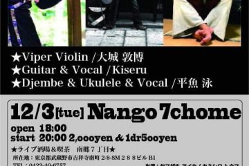 ギターのKiseruさん、初顔合わせの平魚泳さんとの異色のコラボレーションライヴ! 期待が膨らみます♪ ギター&エレキギター:Kiseru ウクレレ、ジャンベ、歌:平魚泳(from大分) ヴァイパー:大城敦博 […]
