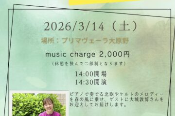 ピアノで奏でる北欧やケルトのメロディーを春の風に乗せ、ゲストに大城敦博 (琉球提琴曲) を迎えてお届けします。 日時∶2026.3.14.(土) 開場∶14:00 / 開演∶14:30 出演∶ Aki∶ピアノ / リード[…]