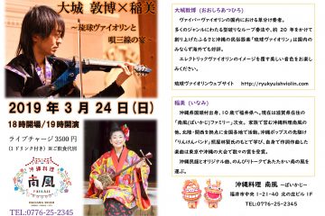初福井公演! 唄三線の稲美さんとご一緒させていただきます♪ 美味しい沖縄料理を食べながらお楽しみください。 開場18:00 開演19:00 出演 稲美:唄三線 大城敦博:琉球ヴァイオリン他 チャージ¥3500-(1dr付[…]
