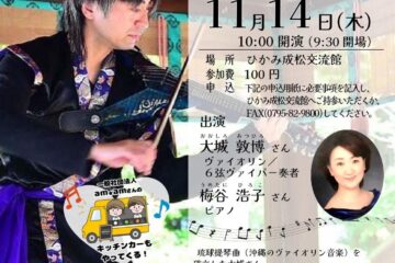 0歳から大人までみんなで楽しいコンサート 日時:2024.11.14.(木) 開店:9:30 / 開演:10:00 出演: 梅谷浩子:ピアノ 大城敦博:ヴァイパー / ヴァイオリン 場所:ひかみ成松交流館 〒669-36[…]