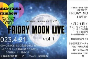 FRIDAY MOON LIVE Vol.1 2023.4.21.(金) 開場: 18:30 開演: 19:00 出演: Yas、TAIKI、にいじゅん、AIZO、ramarama rainbow、 大城敦博(ヴァイパー[…]