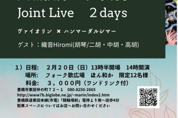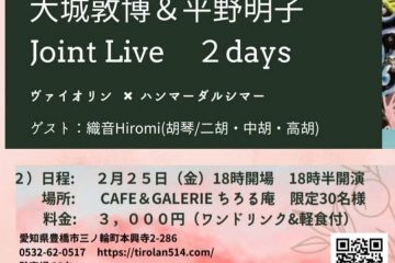 ※本イベントはウイルスまん延の影響により中止になりました。 楽しみにしてくださっていた皆さまには申し訳ありません。 次回お目にかかれることを楽しみにしています。 ハンマーダルシマーの平野明子さんとの共演① 2022.2.[…]