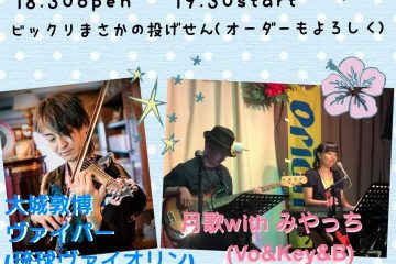 月歌Withみやっち&大城敦博 出演: 月歌:Vo.&Key. みやっち:Ba. 大城敦博:ヴァイパー 場所:ライブ居酒屋Waoya 京都府宇治市宇治若森31-5 宇治タイセイビル地下1階 主な演奏内[…]