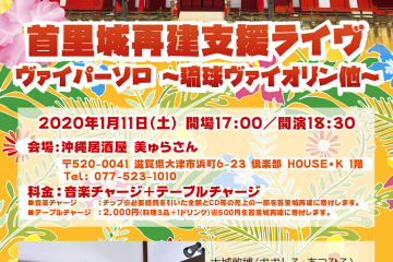首里城再建支援ライヴ ヴァイパーソロ ~琉球ヴァイオリン他~ 2020年1月11日(土) 開場: 17:00 開演: 18:30 会場:沖縄居酒屋 美ゅらさん 滋賀県大津市浜町6-23 倶楽部 HOUSE・K 1階 Te[…]