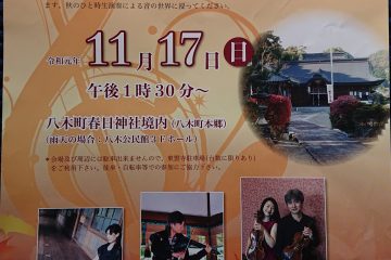 春日神社のコンサートにヴァイパーソロで参加させていただきます♪ 11/17(日)13:30~ 京都府南丹市八木町本郷 春日神社境内 (雨天の場合は八木公民館大ホール) お問い合わせ:090-3625-4881(福嶋) 演[…]