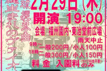 福州園ライヴ 日時:2024.2.29.(木) 開演:19:00 出演:【琉球提琴曲】 大城敦博:6弦 ヴァイオリン & ヴァイパー 場所:福州園内 東冶堂前広場 〒900-0033 沖縄県那覇市久米2丁目29[…]