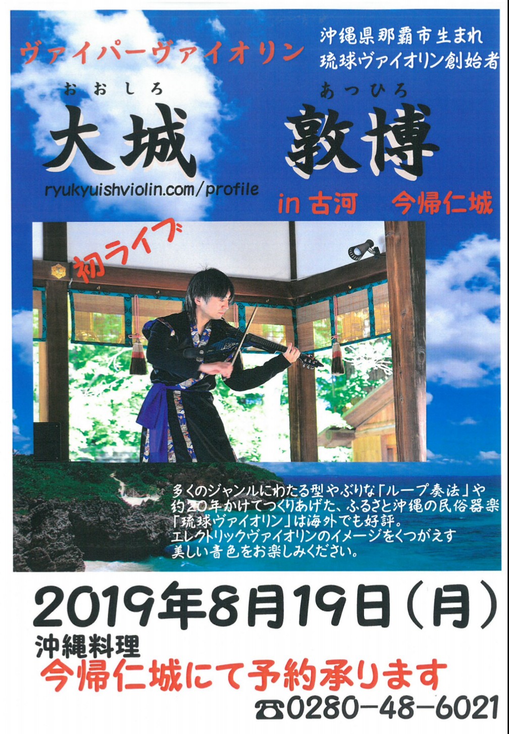 « イベント一覧 このイベントは終了しました。 ヴァイパーライヴ(茨城 古河) 2019年8月19日(月) @ 19:30 - 21:30 « トリオ(千葉 鎌ヶ谷) “みゅーず”定期ライヴ(京都 南丹) » 素敵なご縁をいただいた、茨城県初のヴァイパーソロライヴです。 茨城、古河の沖縄料理店「今帰仁城」にて 「琉球ヴァイオリン」と「ヴァイパーの魅力」をご紹介します。 カレンダーに追加 Google カレンダー iCalendar Outlook 365 Outlook Live 詳細 日付: 2019年8月19日(月) 時間: 19:30 - 21:30 イベントカテゴリー: カフェ・レストラン, ソロライヴ イベント タグ: カフェ・レストラン, ソロライヴ 会場 今帰仁城 三和15 6 古河市, 茨城県 〒306-0042 日本 + Google マップ